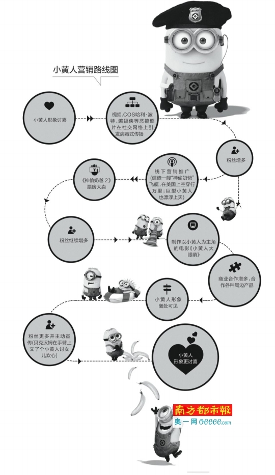 这是环球影业的惯用手法。在《神偷奶爸2》的宣传期,环球公司就大量将小黄人相关图片、音频、视频、恶搞形象投放给大众,如疯传在互联网的小黄人《香蕉之歌》。在环球的“安排”下,小黄人们还在社交网络上Cosplay了许多为人熟知的形象,海绵宝宝、哈利·波特、蝙蝠侠、超级玛丽。有资料显示,这期间环球砸下了2.5亿美元与超过100家特许经销商、宣传方进行了合作。