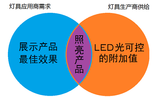 国内传统的LED照明行业,尚处标准化的生产模式,追求规模效益。灯具生产与灯具应用之间信息严重脱节,灯具厂商没有过多去考虑照什么产品,更别说如何用定制光色去更好的展示特定的产品;灯具应用的厂商或商家大多也没意识到好的光色对产品展示效果有着决定性的影响,有这种意识的,也苦于无法找到与之产品光色匹配的专用灯具。
