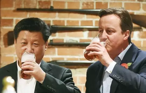 结束小范围会晤时,卡梅伦邀请习主席前往契克斯庄园附近一家叫做theploughatcadsden(犁吧)的当地酒吧,这是一家具有百年历史的乡村酒吧,也是卡梅伦和夫人萨曼莎住在契克斯时经常光顾的地方。习近平同卡梅伦到达小镇酒吧时,天色渐暗,酒吧门口的灯已经点亮,两国领导人走进酒吧,卡梅伦向习主席提起一件往事,他说有次到这里离开时把女儿忘在了酒吧。两个人在吧台并排坐在高脚凳上,卡梅伦向习主席推荐了一款英国人喜爱的啤酒――印度麦啤,并且举杯向习主席说:“祝您健康”,后来上了炸鱼和薯条,品尝后,习主席点赞:“verygood”。