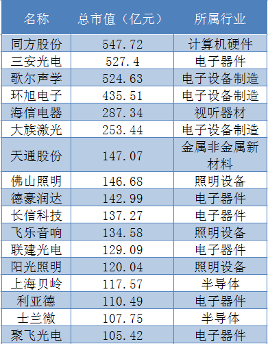 2015年4月13日的统计,产值超过百亿的LED企业包括: