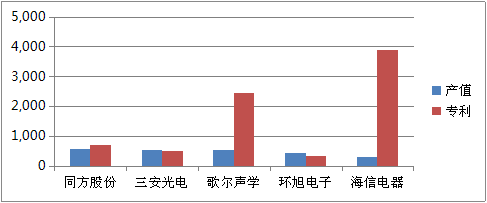 另外,对比发现,总产值排行前五的企业,专利申请数量占17家企业专利申请数量的78.5%,也就是说,LED企业在专利申请中,也同样存在富者愈富的现象。