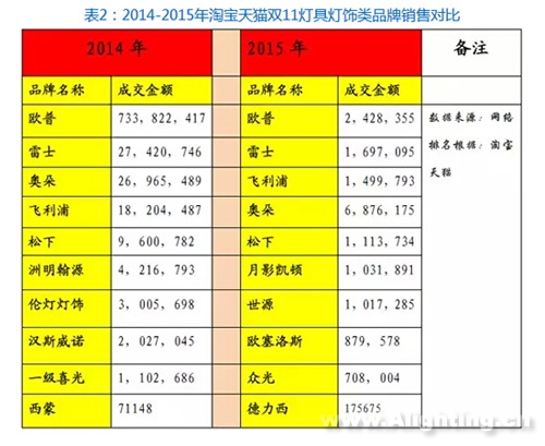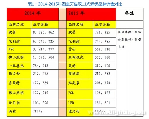 我们从以上2015年双十一热卖光源类、灯饰类电商品牌的销量对比中可以看到:
