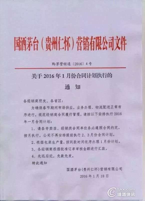 1月18日,国酒茅台(贵州仁怀)营销有限公司发布黔茅营销通【2016】4号文件。该文件指出,为确保春节期间市场供应、业务办理、物流配送正常有序进行,同时规范经销商合同履行管理,要求经销商按以下安排执行今年1月的合同计划: