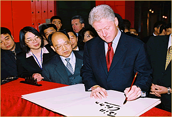 在机场会客厅与四川省省长张中伟短暂会见后,克林顿一行便在前来迎接的剑南春董事长乔天明的陪同下,驱车前往此行目的地——四川著名酒乡绵竹,并面带微笑进入了与剑南春约定的角色——剑南春拓展全球市场战略的揭幕大使。