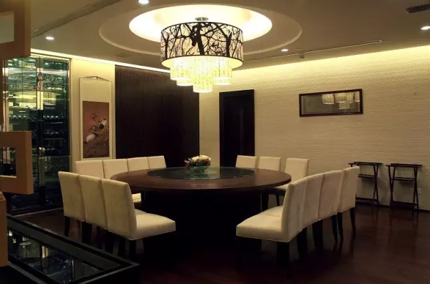 餐桌上方安装提供装饰照明的花灯外,四周安装提供桌面重点照明的射灯,保证美观的同时也为美味的佳肴提供了良好的照明,使人们用餐时,不仅因为菜肴美味心情好,也同时因环境优美而再次光顾。