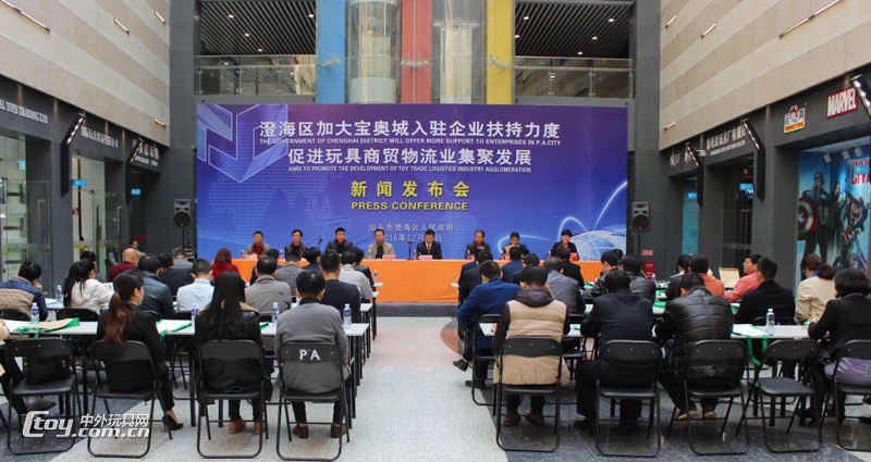 12月16日上午,澄海区委区政府在宝奥国际玩具城召开新闻发布会,向媒体通报有关扶持入驻宝奥城企业、促进玩具商贸物流业集聚发展的有关情况。澄海区委常委、常务副区长尤朝东、澄海区财政局局长陈泽标、澄海区经济和信息化局局长许俊英、澄海区商务局局长陈斯忠、澄海区政府办公室副主任徐荣哲、澄海玩具协会副会长杜瑞生、广东宝奥现代物流投资有限公司副总经理徐燕华等相关领导出席发布会,澄海区委宣传部副部长陈斯涛主持会议。地方及国内近20家媒体的40余名记者参加了发布会。
