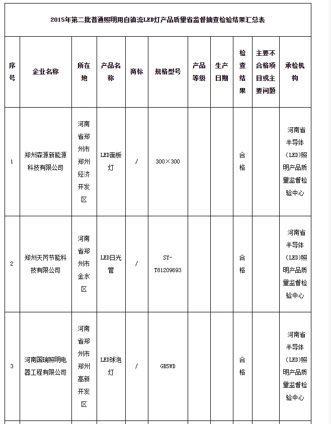 中国质量新闻网讯 河南省质量技术监督局于2015年第2季度对家用纸制品(除卫生纸外)等64种产品质量进行了省监督抽查,并于2016年12月14日在其官网将抽查结果予以公布。其中,抽查了郑州、安阳、新乡、商丘、济源5个省辖市7家企业生产的7批次普通照明用自镇流LED灯产品,经抽样检验,7批次产品全部符合标准要求。