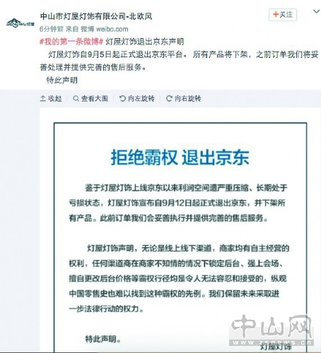 同一天,微博名为“中山市灯屋灯饰有限公司—北欧风”的博主发出声明称,9月5日起正式退出京东平台。随后,这条微博被广泛转发。9月6日,红品爱家灯饰在其官方微信发表声明称,即日起正式退出京东平台,所有京东待售产品全部下架。究其原因,与世源灯饰的说法如出一辙。