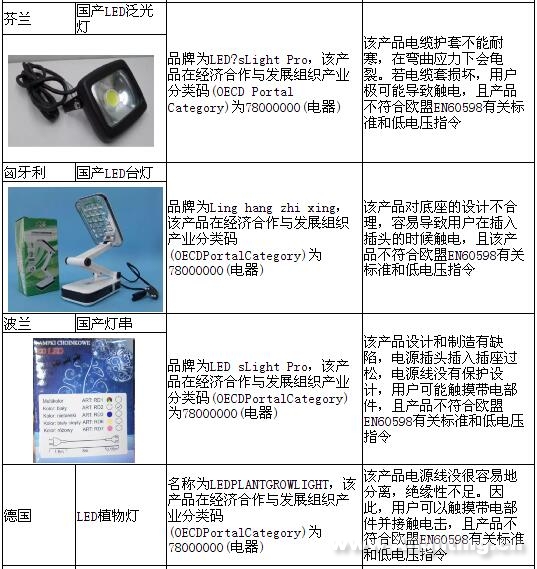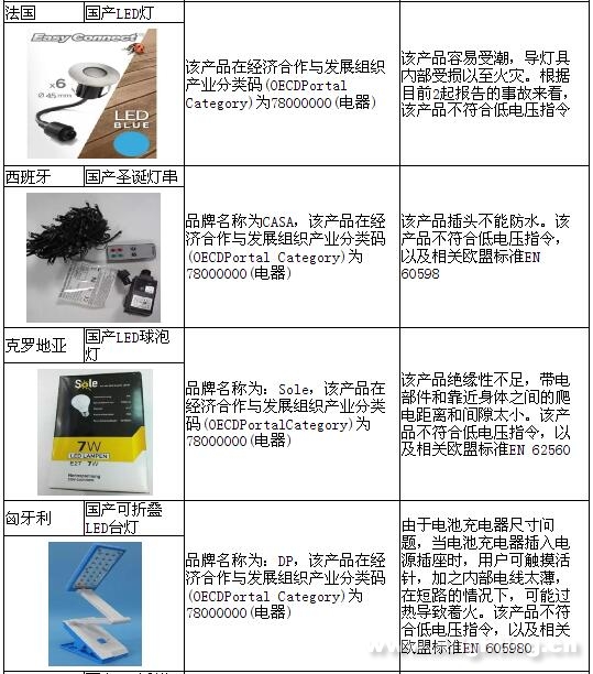 2月,欧盟委员会非食品类快速预警系统召回3款中国产LED灯具。其中“ATOPSUN”牌灯具和“GT Industrial”牌灯具带电部件与易接触金属之间的电绝缘不足,用户有被电击的危险。2款产品均不符合《欧盟低压电指令》及欧洲相关标准EN 60598的要求。另一款“Party Lighting”牌灯具含有短链氯化石蜡,具有致畸、致病、致突变的毒性,检测值高达1.1%,不符合《欧盟持久性有机污染物法规》的要求。