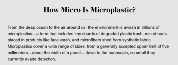 目前在旧金山州立大学工作的Carpenter于1972年3月17日在《科学》杂志上发表了他的观察。他们当年第一次暗示,塑料污染并不仅限于散布在海岸线上的塑料袋、饮料瓶和聚集在臭名昭著的“大太平洋垃圾带”(Great Pacific Garbage Patch,是一种漩涡状的洋流,会将垃圾聚集在太平洋)的可见垃圾。这些塑料制品在阳光的照射下变得很脆弱,被风和海浪侵蚀变得粉碎,碎裂成越来越小的碎片,还有从合成纤维中脱落的微小的所谓的微纤维,以及牙膏等产品中的微小粒子,这些碎片被称为塑料微粒。研究人员说,人类每年生产3亿吨塑料(大约相当于整个人类人口的重量),数以万亿计的降解塑料碎片可能潜伏在自然环境中,并且在很大程度上是看不见的。