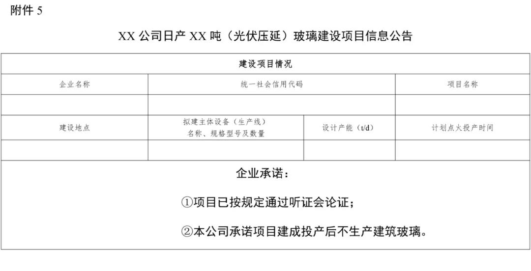 (四)光伏压延玻璃项目可不制定产能置换方案,但要建立产能风险预警机制,规定新建项目由省级工业和信息化主管部门委托全国性的行业组织或中介机构召开听证会,论证项目建设的必要性、技术先进性、能耗水平、环保水平等,并公告项目信息(附件5),项目建成投产后企业履行承诺不生产建筑玻璃(具体文件另发)。