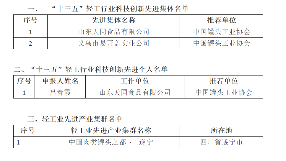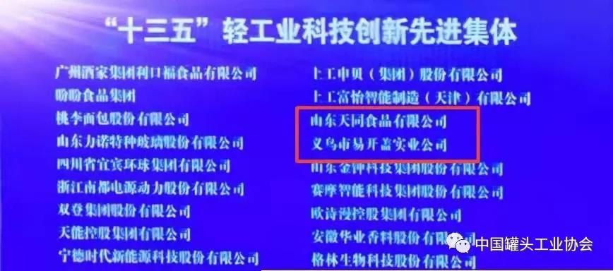 由中国罐头工业协会推荐的两家副理事长单位,山东天同食品有限公司、义乌市易开盖实业公司荣获“十三五”