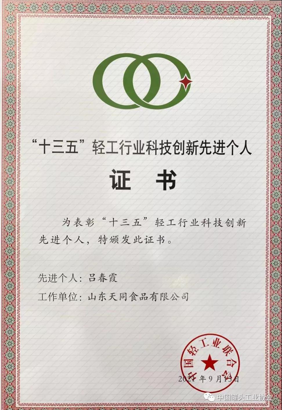 科技创新先进集体。山东天同食品有限公司吕春霞喜获“十三五”