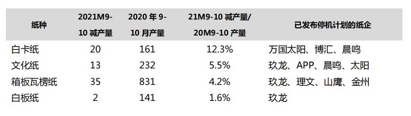 根据东吴证券(10.140, -0.06, -0.59%)统计,2021 年 9 月以来,包括玖龙纸业、理文造纸、山鹰纸业、太阳纸业(11.890, -0.65, -5.18%)(002078.SZ)、晨鸣纸业(7.930, -0.43, -5.14%)(000488.SZ)、APP、博汇纸业(11.260, -1.20, -9.63%)(600966.SZ)等龙头纸企在内的多家纸企已发布停机函。根据已披露的停机函统计,9-10 月各纸种减产量达到70万吨,其中白卡纸、文化纸(包括双铜纸和双胶纸)、箱板瓦楞纸、白板纸减产量分别约为20、13、35、2万吨,占2020年9-10月该纸种产量的比例分别为12.3%、5.5%、4.2%、1.6%。