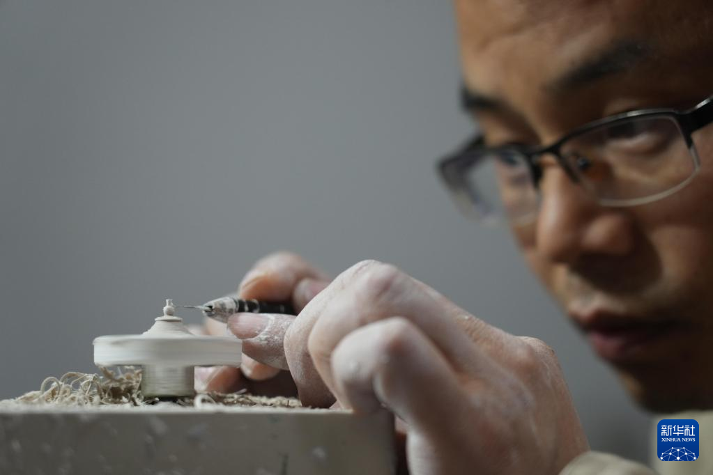 12月14日,王文化在进行微型陶瓷作品“利坯”工序。