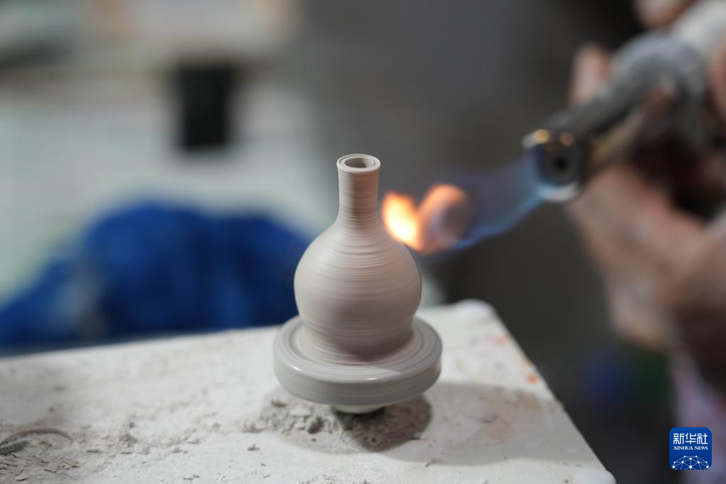 12月15日,王文化使用喷枪烘干一件微型陶瓷作品。