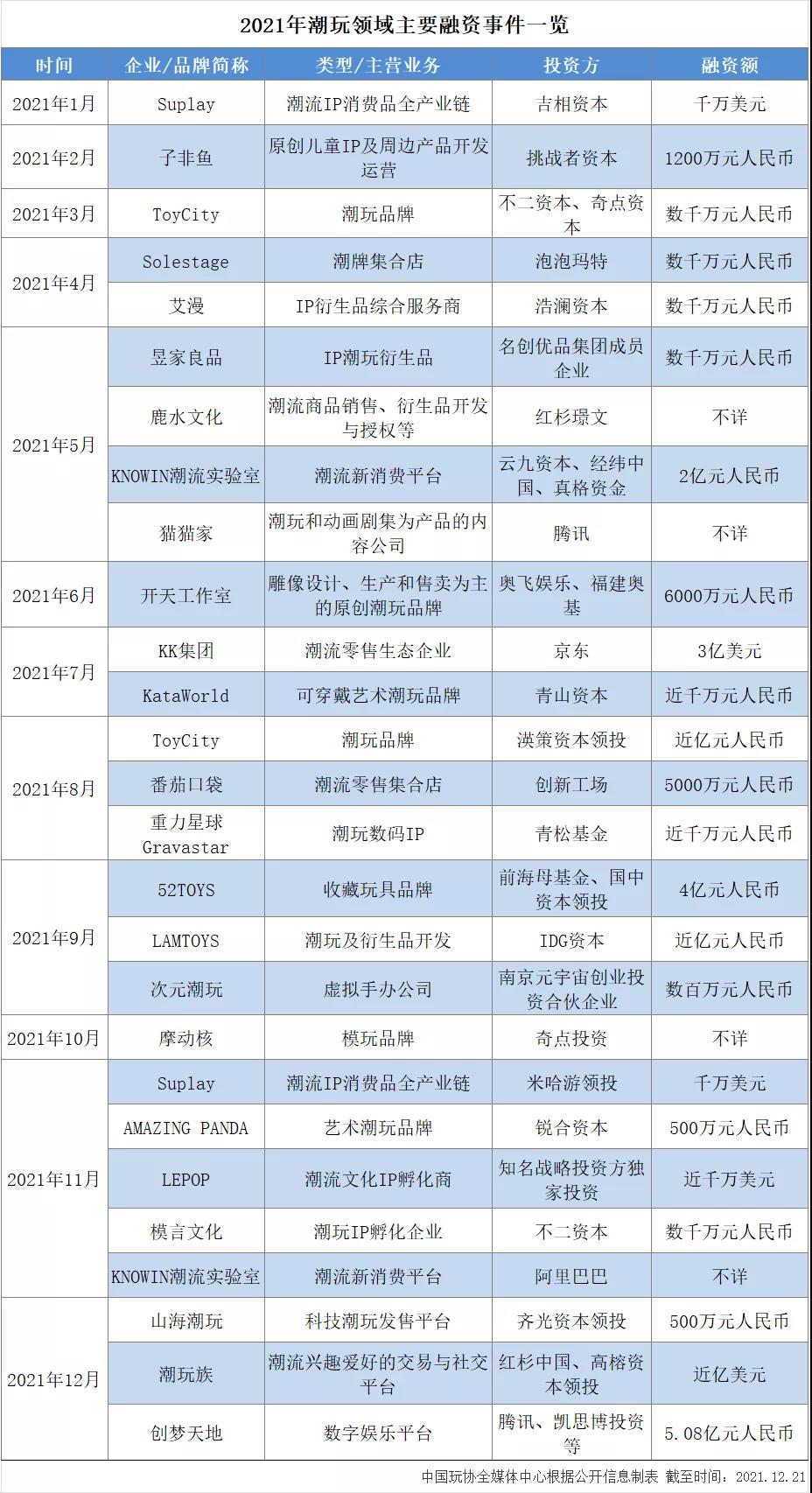 2021年,中国潮玩市场规模持续扩大,融资消息不断。据中国玩协全媒体中心不完全统计,截至12月21日,潮玩领域投融资事件在千万级以上的就超过20起,所涉及的主营方向包括产品开发、潮流零售集合店、潮玩交流社区平台等等,中国潮玩赛道更加宽广。