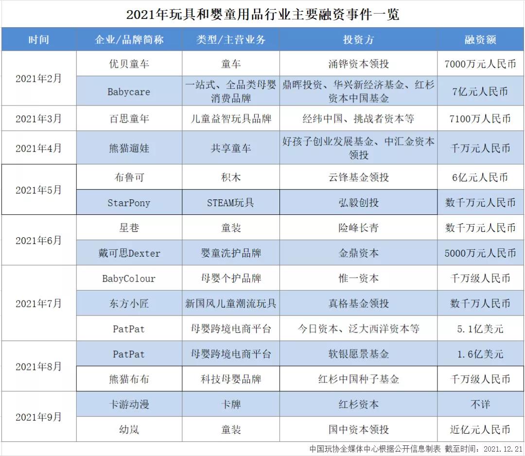 2021年即将过去,复盘这一年行业融资事件可以看出,潮流及收藏玩具领域仍是资本重点关注的对象,而在玩具、婴童用品行业,那些获得大笔融资的企业,均是通过精准定位、差异化运营等举措,在新赛道上建立起了优势。