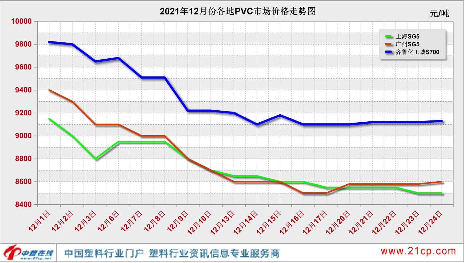 想想年中那会儿的轰轰烈烈,平平淡淡的收尾,似乎也还不错!12月份的PVC市场,在需求淡季及期货持续走跌的影响下,基本维持弱势运行。截止27日,华东地区5型电石料主流报8450-8650元/吨;华南地区5型电石料主流报8600-8780元/吨;华北地区5型电石料主流报8350-8480元/吨。下面跟着小编一起来简单回顾下12月份PVC市场走势的情况吧!
