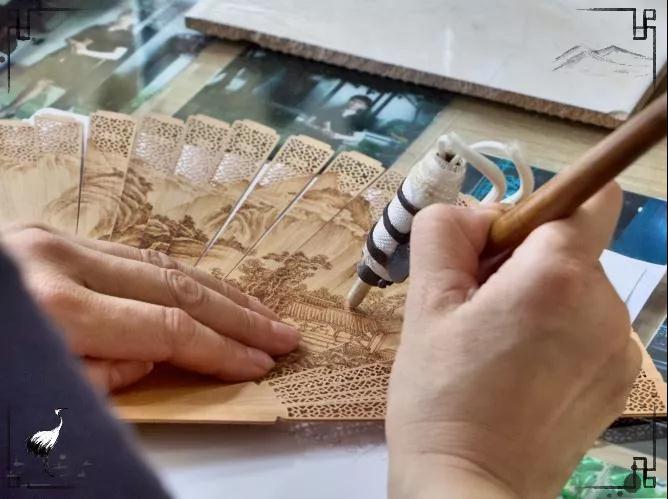 烫花:檀香扇制作流程之中,烫花工艺在民间流传运用的时间已有几个世纪之久,也被称作火绘,还有烙画,不单在檀香扇的制作上有使用,其它种类的家具、饰品也有运用,在需装饰的工艺品表面,利用专用的传热金属电笔,在扇面烫烙呈深浅褐色的图样,制作者用银头电笔并通过对其温度、性能的控制和掌握,运用在扇面上常见的表现题材有山水、园林、人物(仕女)以及翎毛花卉。实质上是以木代纸、以电笔代铅笔的“绘画”。