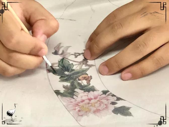 画花: 画花,又称“绘花”,即在绢面扇料上进行各种题材内容的勾勒和敷色。过去的绘画题材偏重于花鸟、仕女、花卉。就花卉而言,也仅有牡丹、莺栗和菊花三种素材。经过合作化后多年的发展,檀香扇的画面在线条、色彩、技法方面都有了创新。画工的绘画题材广阔,内容丰富,今非昔比。艺术水平有了很大提高,在色彩上既非大红大绿,又有较强烈的对比装饰效果,并吸收国画设色的传统技法,运用墨的浓淡来烘托色彩。用笔工细而简练,工整而不呆滞,简洁而不虚空。檀香扇的绘画基本上是属于工笔中国画的一类,但又不失国画的单纯移植。它既然运用在檀香扇上,就必须服从整把扇子造型上的需要,就应具有装饰风格,和一般的绘画有所区别。总的来说,檀香扇的画花是中国话与民间传统装饰的结合。