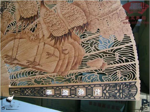雕花: 雕花,即在檀香扇的扇边上进行浅刻、浮雕、透雕和微雕等装饰。一把扇子展开时显示扇面,闭合时则露其扇边。扇边也是一把扇子的重要装饰部分。檀香扇的扇边或以浮雕,或以镂雕,与扇面图案相得益彰。
