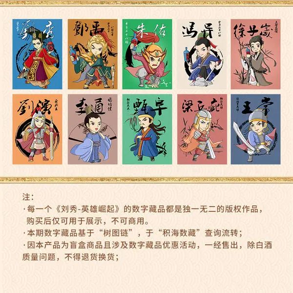 张弓酒起源于一则3000年前的历史传奇,与汉高祖七世孙刘秀有着不解之缘,刘秀是张弓酒的灵魂人物,张弓酒数字藏品NFT的设计便是由此出发。围绕刘秀研发团队设计了总共12期数字藏品NFT,分别映照刘秀的12段人生发展时期,每期共有10位英雄人物登场。第一期NFT “英雄崛起”,分为第一批与第二批发布,其中第一批即今年3月份发售的5000份,以刘秀早年经历为背景出场5位英雄人物,大Boss刘秀对应数字藏品NFT-SSR,即超级稀有级。