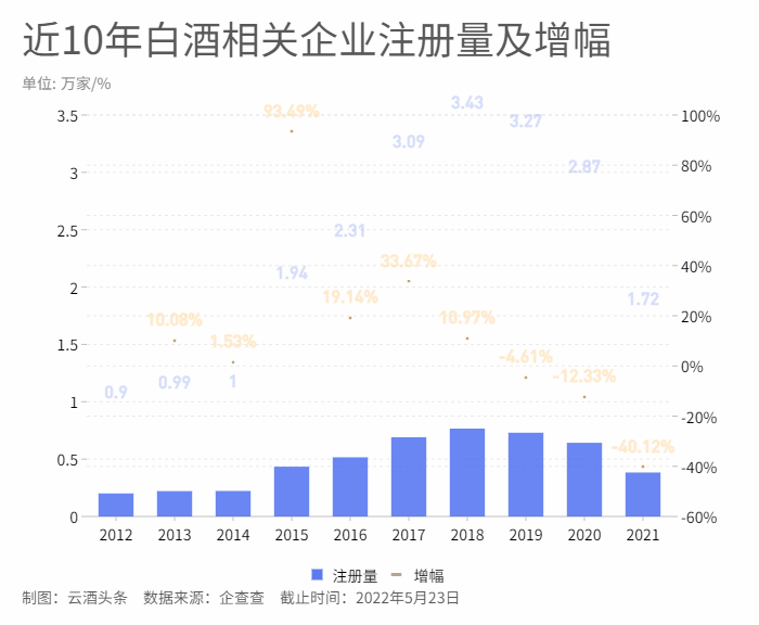 企查查数据显示,我国白酒相关企业注册量在2012年仅为0.9万家,2015年增长率达93.49%,直至2018年,其注册量最高峰为3.43万家,较2012年同比上升381%。