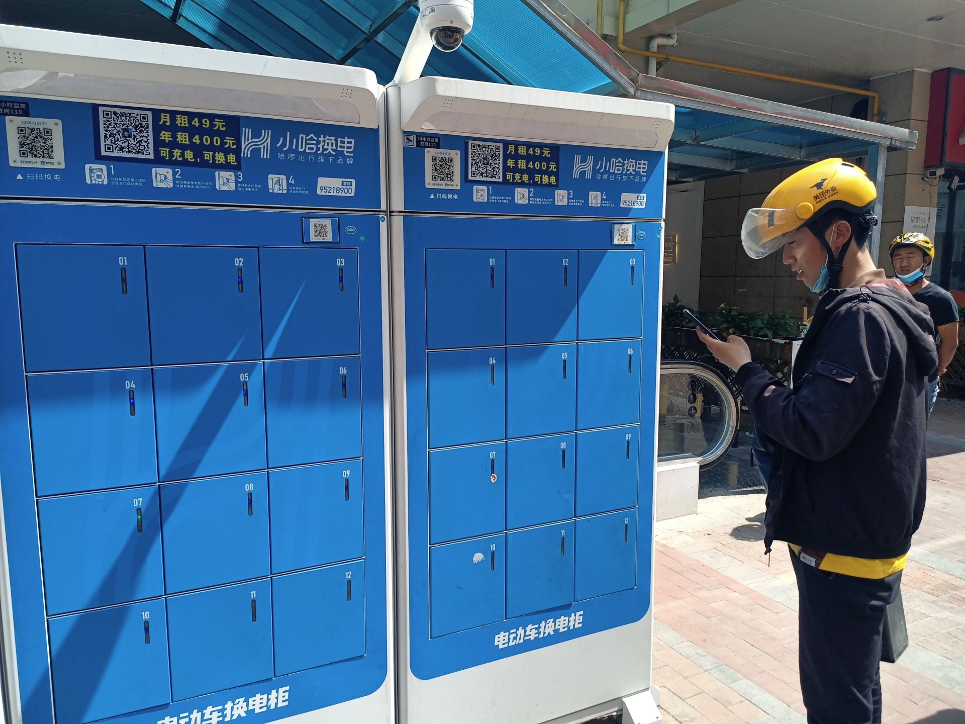 外卖小哥在换电柜前扫码换电池。
