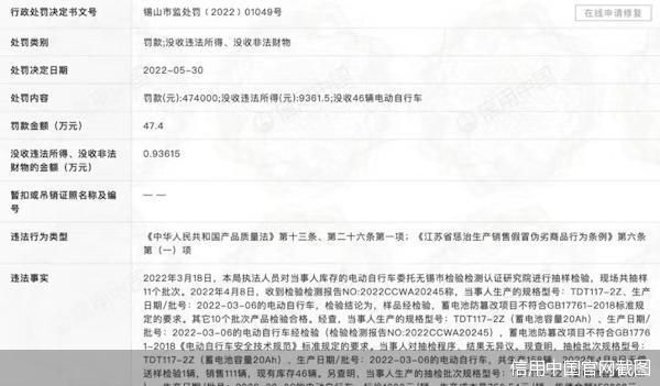 信用中国官网信息显示,3月18日,无锡市监局执法人员对当事人库存的电动自行车委托无锡市检验检测认证研究院进行抽样检验,现场共抽样111个批次。4月8日,无锡市监局收到检验检测报告,其中一批次电动车产品蓄电池防篡改项目不符合GB17761-2018标准规定的要求。经查,该批次电动自行车共生产158辆,销售111辆,现有库存46辆,标价1000元/辆,生产成本是750.54元/辆。货值金额15.8万元,违法所得9361.5元。