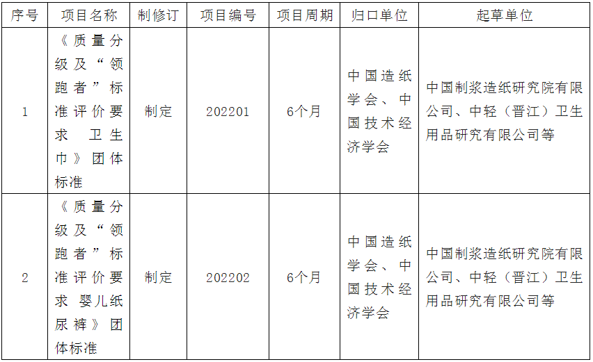 关于《质量分级及“领跑者”标准评价要求 卫生巾》《质量分级及“领跑者”标准评价要求 婴儿纸尿裤》团体标准立项的公告