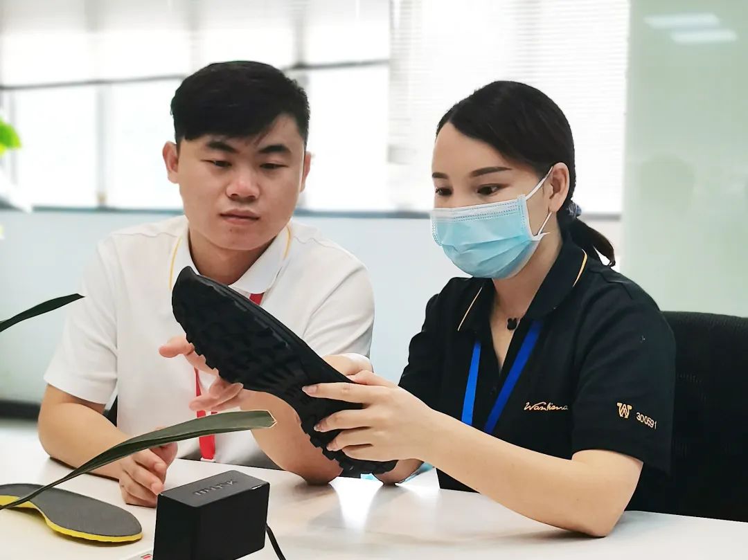在东莞万里马制鞋研发室,郭金术与公司其他技术人员正在研究一款新上市的中底鞋材。“现在市面上鞋类新产品很多,其中中底材料的性能各有不同,我们需要掌握这些最新的信息,以了解行业的发展动态和趋势。”郭金术表示,公司会不定期举办各工种的职业技能培训,包括理论培训、实操培训与经验交流分享活动,以提升员工的技术水平。在最近的实操培训活动中,大学专业为高分子材料的郭金术对当下流行的中底新材料配方产生了浓厚的兴趣。“通过对高分子材料的改性,使中底材料具备更佳的防水与回弹等性能,让穿着人员更加舒适,是我在研究的方向。”郭金术介绍说,不久前,他通过了制鞋工的三级设计师培训,获得了证书。现在他更加热爱他的工作,将继续在技术上进行研究,为获评二级制鞋工、一级制鞋工努力。