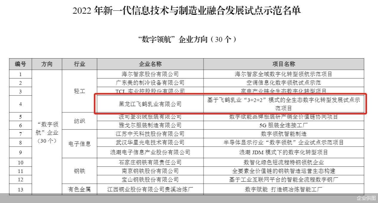 据了解,“数字领航”企业是国家今年新提出的称号,聚焦全要素、全流程、全生态数字化转型,目的是打造一批技术实力强、业务模式优、管理理念新、质量效益高的制造业数字化转型标杆。本次评选工信部围绕技术、业务、管理、成效四大方面综合评分,30家企业经过多轮严苛筛选成功入围,其中飞鹤是唯一的乳企。