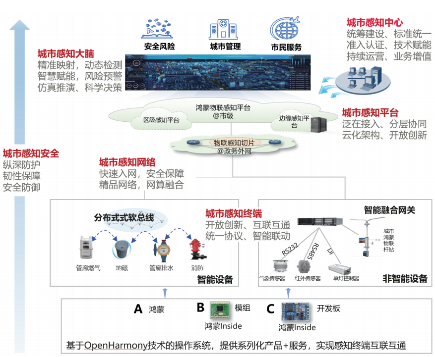 鉴于城市感知体系在现代化城市构建中的重要作用,《白皮书》着重提到,城市感知体系建设是以 OpenHarmony 操作系统及统一的标准规范为基础,实现感知终端的互认互信。同时,通过构建城市互联互通的感知网络、分层协同的感知平台、统一汇聚的感知大脑、纵深防护的感知安全以及持续运营的感知中心,解决传统城市感知存在的底账不清、烟囱林立、数据孤岛、感知盲区等问题,实现城市动态精准感知、终端互联互通、协议标准统一、业务分级协同、场景持续创新、数据持续运营,提升城市治理数字化水平。