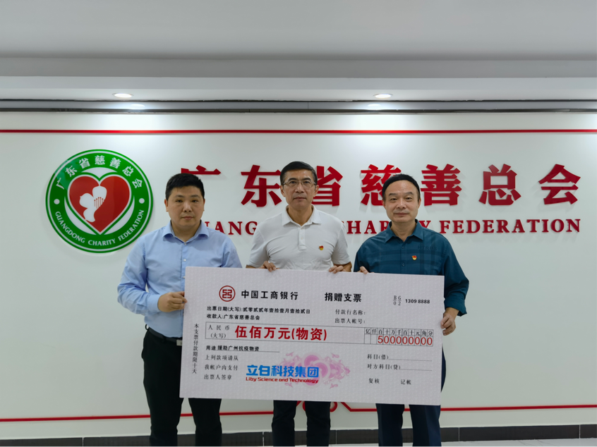 11月12日,广东省慈善总会常务副会长兼秘书长钟晓明,广东省慈善总会副秘书长李彬接受了立白500万元消毒除菌产品的捐赠支票。在捐赠现场,海珠区政府党组成员、副区长苏明庆,海珠区民政局局长谢强,海珠区民政局一级调研员、区慈善会会长罗日珊与立白凯晟控股副总裁、立白科技集团党委书记、副总裁许晓东,立白科技集团纪委书记、董事长助理陈琳一起进行了现场捐赠。