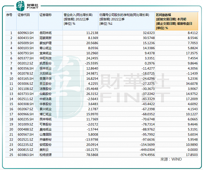 从Wind造纸中信成份股看,2022年前三季度净利润同比下滑的企业占绝大多数。其中下滑较大的有安妮股份(002235.SZ)、美利云、松炀资源(603863.SH)等。