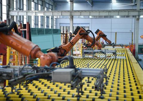 在沙河市鸿昇玻璃有限公司,自动化生产线上的机械手臂在装运玻璃。新华社记者牟宇摄