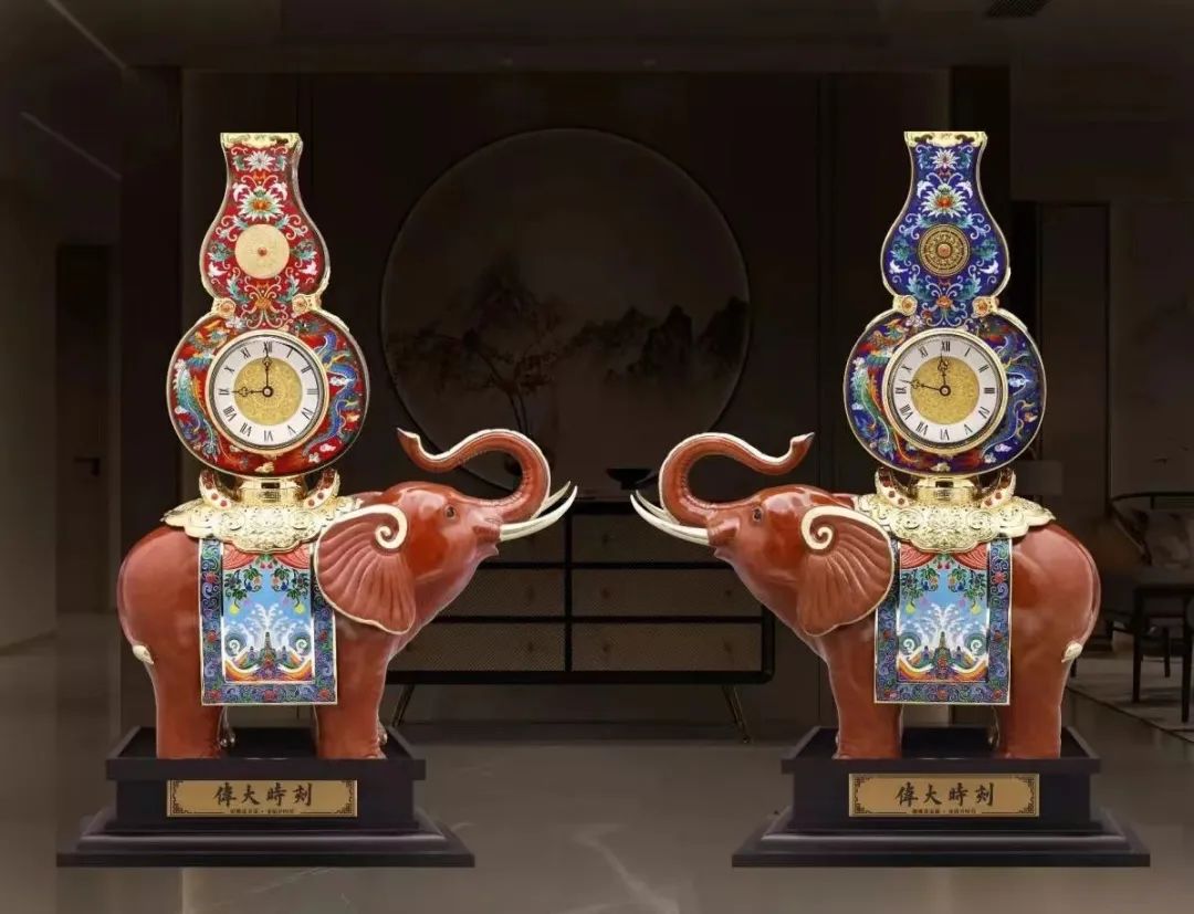 据悉,《伟大时刻》计时仪的创作灵感,源于故宫博物院太和殿《象驮宝瓶》、故宫博物院珍宝馆《铜镀金自开门寿星葫芦式钟》、沈阳故宫博物院《掐丝珐琅象驮宝瓶》三大国宝。整体造型以双象驮大吉葫芦瓶呈现,宝象装饰元宝型金钱鞍鞯,计时仪表盘黄金压铸,装饰钻石,璀璨夺目,敦实霸气。景泰蓝葫芦瓶上肚中心錾刻传承千年的古代计时仪——日晷,镶嵌红玛瑙,四周装饰白鸽、缠枝莲纹宝相花,寓意鸿运当头、花团锦簇、平和安顺;背面錾刻吉庆有余纹饰,祝福生活和谐美满、幸福、自在。葫芦下肚部分为作品亮点所在:凤衔牡丹、龙踏祥云,环绕黄金表盘起舞,主纹饰取材人民大会堂宴会厅穹顶,创作灵感源自敦煌莫高窟第31窟宝相花藻井图案;镶嵌八颗钻石,寓意龙凤呈祥、四时安康、招财进宝。计时仪在设计、创作中沿袭了宫廷钟表的实用性、观赏性和收藏性,同时汲取庄重典雅、古色古香的皇家风格,搭配一枚如意福禄钥匙,装饰缠枝莲纹、方孔金钱,钥匙转动寓意永远赚钱。内部机械机芯为德国赫姆勒—美时嘉设计研发中心的最新科研成果,由德国赫姆勒中国设计中心独家定制,搭载自动校对修正机械钟走时误差装置,将科技与传统工艺有机结合,具有开创性意义。象背鞍鞯由元宝形鞍座和花丝烧蓝褡裢组成,鞍座托瓶处装饰如意回形纹,寓意万代吉祥;元宝两头隆起,各镶嵌九颗玛瑙,雕刻缠枝莲纹宝相花和金钱纹,寓意财富连绵不绝。褡裢上红色帷幔徐徐拉开,象征步入发展新蓝图,葫芦、藤蔓祝颂福泽绵延、子孙昌盛绵绵;江崖海水融山汇水,涵盖家族兴旺、福山寿海的磅礴之势,寓意祥瑞昌盛、华章开启;边饰卷草纹四周镶嵌玛瑙,寓意祥瑞天下、基业长青、江山永固。铜雕宝象体型健硕,驮景泰蓝宝葫芦瓶,稳如泰山,头鼻向上,寓意吸财纳福、天下太平。象身高温着色故宫红,端庄雅致、沉稳大气,配搭金色边饰尤显奢华;足下装饰金钱纹,寓意步步生财,与葫芦瓶交相辉映。宝象昂首阔步蓄势前行,远观器宇非凡,近看气象万千。