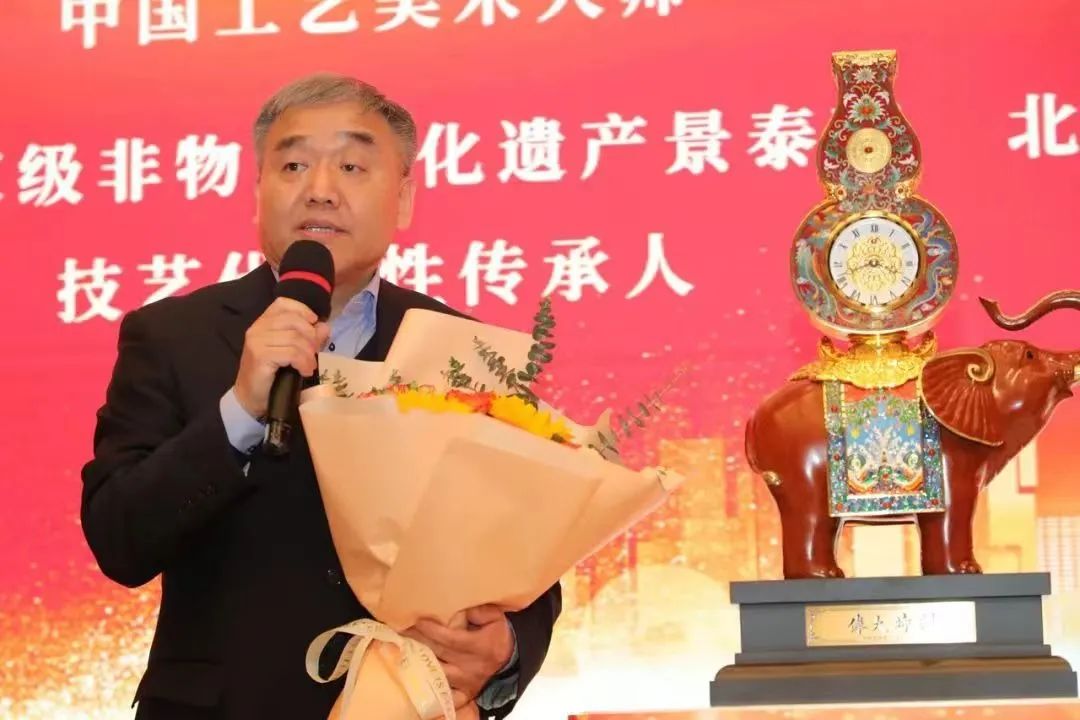 周郑生在致辞中表示,守正创新是新时代文化艺术创作、文化产业发展的核心要求,当前,让工艺美术“守正创新”已成为共识。要立足于当下、立足于生活,从时代审美出发,在纹样、装饰、材料、工艺等方面进行创新应用,将传统工艺回归生活价值,以此实现传统非遗技艺的当代转换。《伟大时刻》铜雕景泰蓝·金钻计时仪,作品集八大非遗技艺于一身,彰显出一幅国泰民安、蓬勃昂扬的大国气派与辉煌壮丽、锦绣华美的盛世景象。作品不仅弘扬中华优秀传统文化,又与现代文化潮流、新时代、新格局相适应,对非遗传承和工艺美术的创新发展,都是一个重大的跨越和提升。