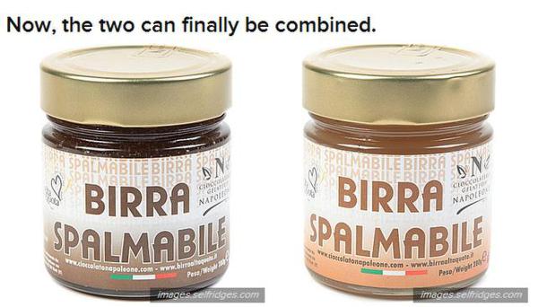 这种啤酒酱是意大利巧克力品牌Napoleon和啤酒品牌Alta Quota合作的结晶,它口感滑腻,类似奶油,可以用来蘸面包片。生产商称他们虽然不是第一个把啤酒做成非液态的生产商,但是他们的高质量产品非常成功。现在,人们终于可以名正言顺地在早上“喝啤酒”了。