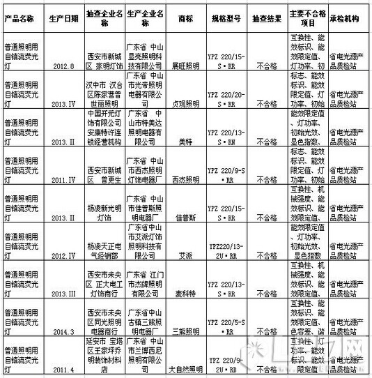 陕西省质量技术监督局7月7日公布2014年2季度普通照明用自镇流荧光灯产品质量监督抽查结果,有9批次样品不符合标准要求,涉及展旺照明、贞观照明、美特、西杰照明、佳普斯、艾派、麦科特、三熊照明、大自然照明等品牌,均为“广东制造”。