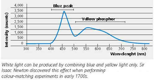 图:LED的白光可由蓝光LED涂装黄色荧光粉获得。早在1700s,大牛牛顿就在颜色混成试验中发现了白光可由蓝光和黄光混成这一现象。
