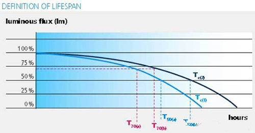 图:LED的发光量会随着时间而衰减。因此,在照明设计时,LED的寿命应该根据不同的应用场合来进行确定。比如,对于应急照明而言,应该采用L80,亦即将LED灯具的光通量衰减到初始光通量的80%时的寿命作为其设计寿命。在一般照明中,则可以按照L70或者L50来进行设计。LED的寿命很大程度上取决于环境温度和散热设计,如果灯具运行在较高的环境温度(如图中Tc(1)),或者灯具的散热设计很差时,它的寿命会大大缩减。