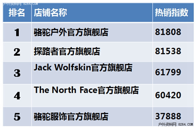 这里提及的店铺版是指:“户外\登山\野营\旅行用品”行业店铺排行。数据来源也是淘宝数据魔方,依据指数是“热卖指数”。热卖指数:主要根据店铺支付宝到账金额,结合销售量,通过数据魔方的公式转换后得出店铺在行业的热卖程度数值。需要提及的是,这个公式淘宝并没有没有公开。淘宝对于这个排行的定义为:找出行业里最火的店铺。