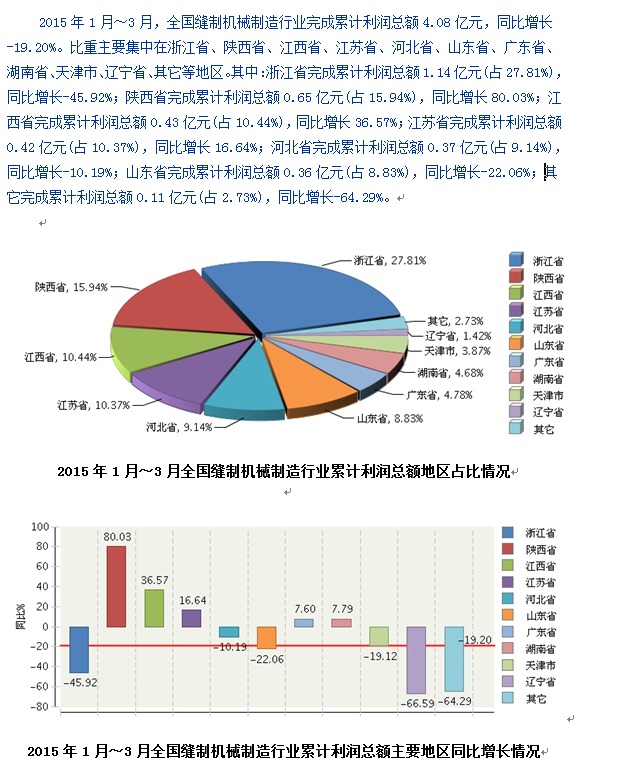 2015年3月浙江缝制机械制造行业累计利润同比下降45.92%