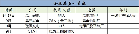 此外,9月14日消息称,台系LED芯片大厂晶元光电于9月17日资遣65名员工;17日又有消息称,晶电竹科厂预计分三批资遣76名员工,另外,晶电集团旗下璨圆光电龙潭厂及平镇厂,也同步资遣共计39人。总计晶电集团此波共资遣180人,占总员工数约3%。