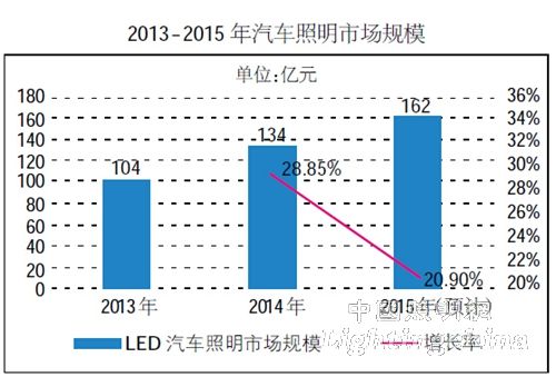 随着LED 日间行车灯、LED 刹车灯等LED 汽车照明的广泛应用,2014 年市场规模达134 亿元,2015 年预计达到162亿元,同比增长20.9%。中国国内主要的车灯厂商,如长城、奇瑞等品牌主要采用台系灯珠,配件厂组装成车灯,现主要应用在氛围灯、刹车灯、雾灯等产品上,代表企业有三安光电和奇瑞汽车双方合资的安瑞光电,产品主要用于奇瑞车上。
