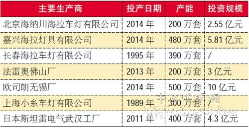 据不完全统计,当前,我国LED 汽车照明企业年产能超过2000万套。中国汽车产能预计在2015年达到5000 万辆,实际产能规模利用率为55%左右。下面的五大品牌七个工厂的产能有望垄断三分之一的汽车照明市场。