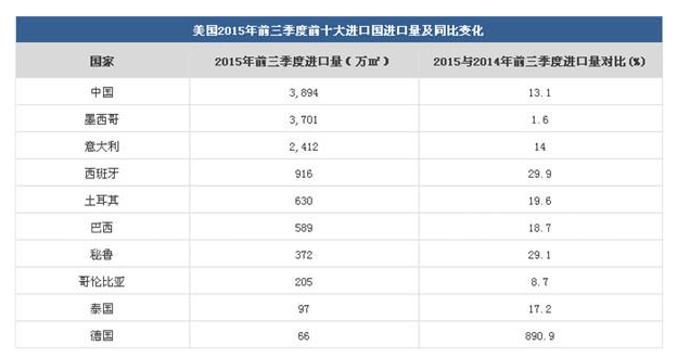 意大利《陶瓷世界评论》和北美陶瓷协会(TCNA)又传来对中国利好信息,两家发布了美国陶瓷行业报告,披露了美国瓷砖行业产能、进出口情况以及房地产经济大环境,为有心深耕美国市场的建陶企业,提供了第一手翔实的资料。报告指出,美国瓷砖总消费量已经连续六年增长,2015年总量可达2.5亿m²;在2015年前三季度前五大进口国中,中国以3.894万m²位列第一;加拿大和墨西哥成为其出口的最大目的国,对两国的出口量和出口额都分别达到了57.0%和18.1%。