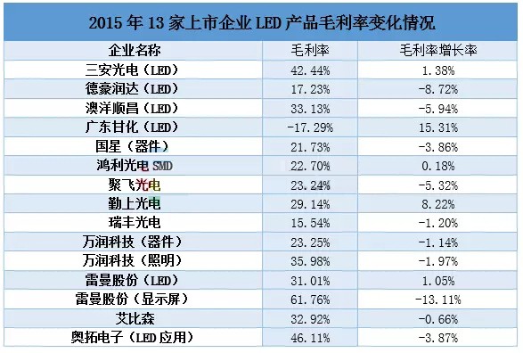 据统计13家LED企业2015年LED主营产品的毛利率发现,封装器件的毛利率2015年整体出现下滑,只有鸿利维持着0.18%的增长,芯片领域三安依然维持毛利率增长,而澳洋顺昌、德豪润达LED的毛利率分别下跌了5.94%和8.72%。